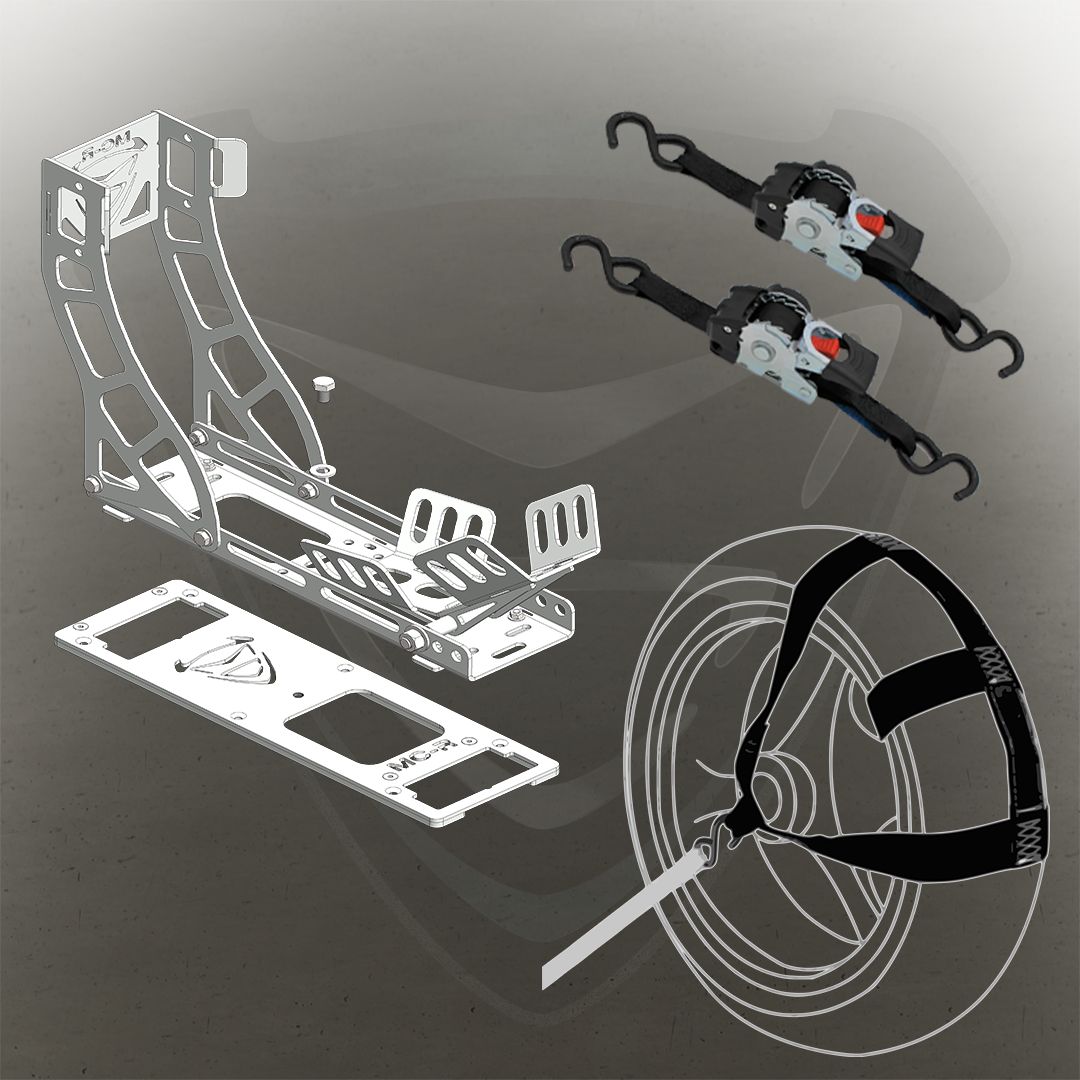 - 1x Bloque Roue / Râtelier Basculant MC-Racing : épaisseur de 4 mm pour avoir une bonne tenue de la roue avant. Idéal pour des roue 15 à 21 pouces